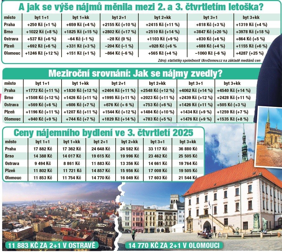 У Празі оренда за рік зросла в середньому на 12%, у Брні — на 11–12%, у Плзені та Оломоуці — на 7–10%, а навіть у дешевшій Остраві — на 6%.
