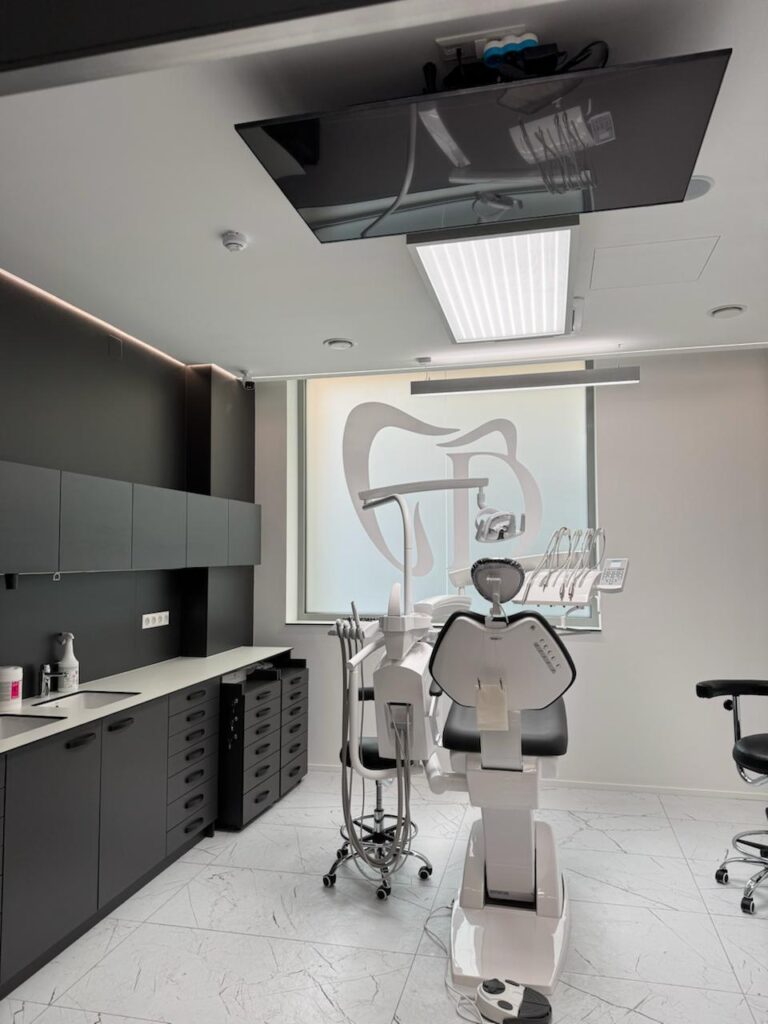 Тобто, в клініці створено індивідуальний формат обслуговування. А ще є окрема кімната для відпочинку після наркозу, що особливо важливо для пацієнтів після складних маніпуляцій. Над стоматологічним кріслом — телевізор, що допомагає переключити увагу під час тривалих процедур. У зоні очікування — напої та спокійна атмосфера.