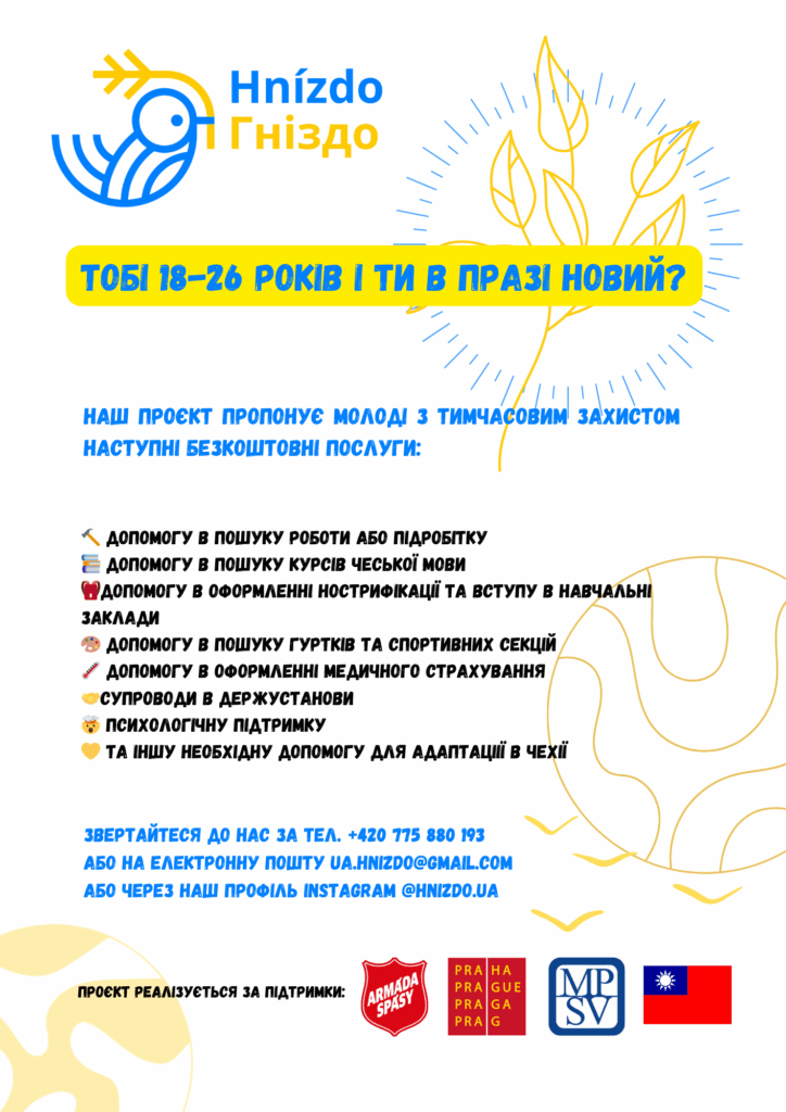 Празька соціальна служба «Гніздо», яка вже три роки працює з молодими українськими біженцями, оголошує, що має можливість приймати нових клієнтів. Якщо вам від 18 до 26 років і ви перебуваєте в Чехії на підставі тимчасового захисту — ця допомога для вас.