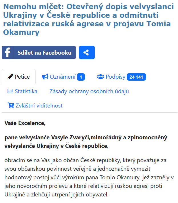 Нагадаємо, у своїй новорічній промові спікер заявив, що неможливо продовжувати надсилати зброю для «підтримки абсолютно безглуздої війни». Він також наткнувся на президента Володимира Зеленського та його оточення. «Нехай крадуть, але не в нас більше. І нехай така країна не буде в Європейському Союзі», – сказав Окамура. Ці заяви були засуджені опозицією, яка ініціює відставку Томіо Окамури з посади голови нижньої палати парламенту. За словами посла України в Чеській Республіці, цитовані слова є непристойними та абсолютно неприйнятними. Президент Петр Павел заявив, що вони викликають занепокоєння в Чеській Республіці та за кордоном. Глава держави обговорить це питання з прем’єр-міністром Андреєм Бабішем (партія ANO). Також виникла ще одна он-лайн петиція із закликом відставки Томіо Окамури з посади спікера парламенту за послідовне роздмухування ним ксенофобських, ненависних поглядів. Цю петицію підписало на цей час понад 17 тисяч чехів.